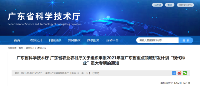 6月8日,廣東省科學技術廳、廣東省農業農村廳下發關于組織申報2021年度廣東省重點領域研發計劃“現代種業”重大專項的通知,標志著2021年度廣東省“現代種業”重大專項(以下簡稱“專項”)申報正式開始。