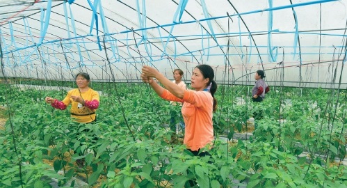 貴州省錦屏縣采取“黨支部+龍頭企業+合作社+農戶”的生產模式,從外省引進“金玉大青椒”良種,鼓勵農民發展辣椒種植產業。“金玉大青椒”屬早熟品種,果長20-25厘米,果大4.5-5.5厘米,果肉厚0.4厘米,單果重150-180克。豐產性能出類拔萃,適應范圍廣。目前,“金玉大青椒”已在錦屏縣大面積推廣,成為當地群眾增收致富的主打產業。圖為近日,新化鄉新化所村大棚蔬菜基地,合作社社員們正在給“金玉大青椒”綁枝。