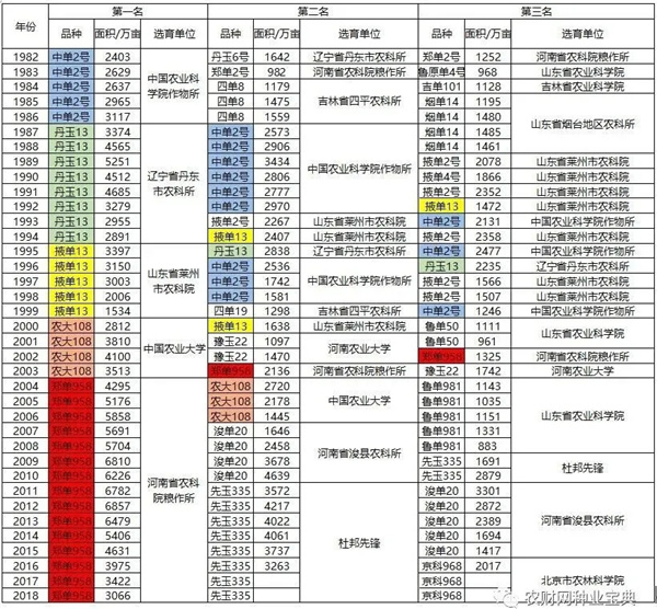 截至2018年,全國年推廣面積前三名的的玉米大品種,推廣面積基本均在1000萬畝以上,京科968在2016年的推廣面積達2017萬畝,被認為正引領玉米種業進入新的發展階段。數據來源:《中國種業發展報告》