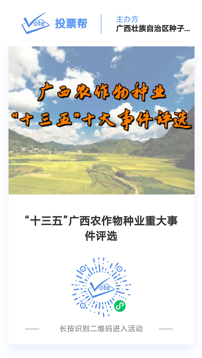 在慶祝中國共產黨成立100周年之際,為宣傳好廣西種業發展成果,廣西種子管理站總結了“十三五”以來廣西農作物種業發展成效,開展“十三五”廣西農作物種業重大事件評選活動。請您投上寶貴的選票,為廣西種業加油鼓勁。