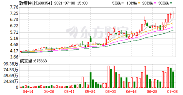 統計數據顯示,截至2021年6月30日收盤,敦煌種業報收于6.18元,較2020年末的4.36元上漲41.74%。3月15日,敦煌種業盤中最低價報3.84元,股價觸及上半年最低點,6月23日股價最高見6.97元,最高點相較于年初最大漲幅達到59.86%。