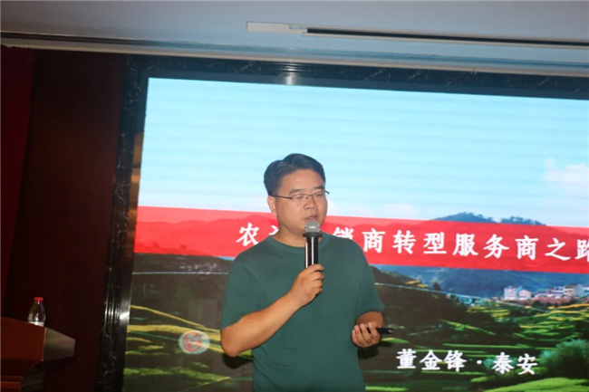 中國農技推廣協會農業產業融合分會會長、山東豐信農業創始人董金鋒則就農資經銷商轉型服務商的原因、方式以及落地等進行了分享和探討。