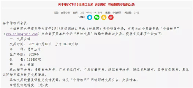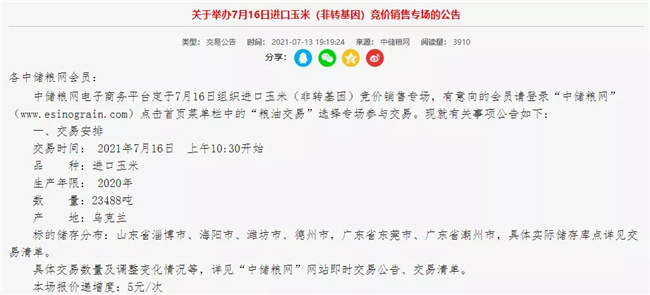 同時,進口玉米繼續投放市場,中儲糧7月16日將安排兩場進口玉米拍賣,分別投放2萬噸烏克蘭非轉基因進口玉米和17萬噸美國轉基因進口玉米。與上輪投放相比,烏克蘭玉米數量大幅增加,但美國玉米繼續占據拍賣的絕對主力位置。