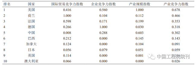對標美國、荷蘭、德國、法國、澳大利亞、英國、加拿大、日本、巴西等種業強國,以貿易競爭力指數、企業競爭力指數、產業規模指數為評價指標,從市場和產業主體兩方面對國際種業產業競爭力進行分析評價。貿易競爭力指數代表了一個國家參與國際市場競爭的能力,由貿易競爭指數、顯示比較優勢指數、國際市場占有率、市場開放度來具體表征。