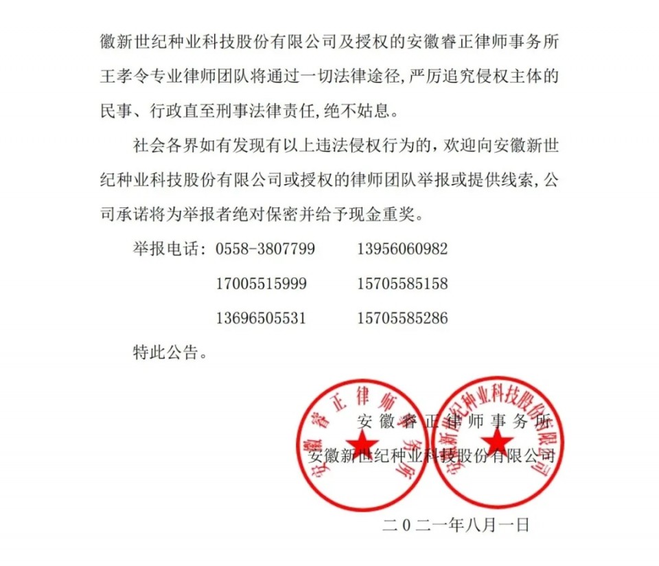 社會各界如有發現有以上違法侵權行為的,歡迎向安徽新世紀種業科技股份有限公司或授權的律師團隊舉報或提供線索,公司承諾將為舉報者絕對保密并給予現金重獎。