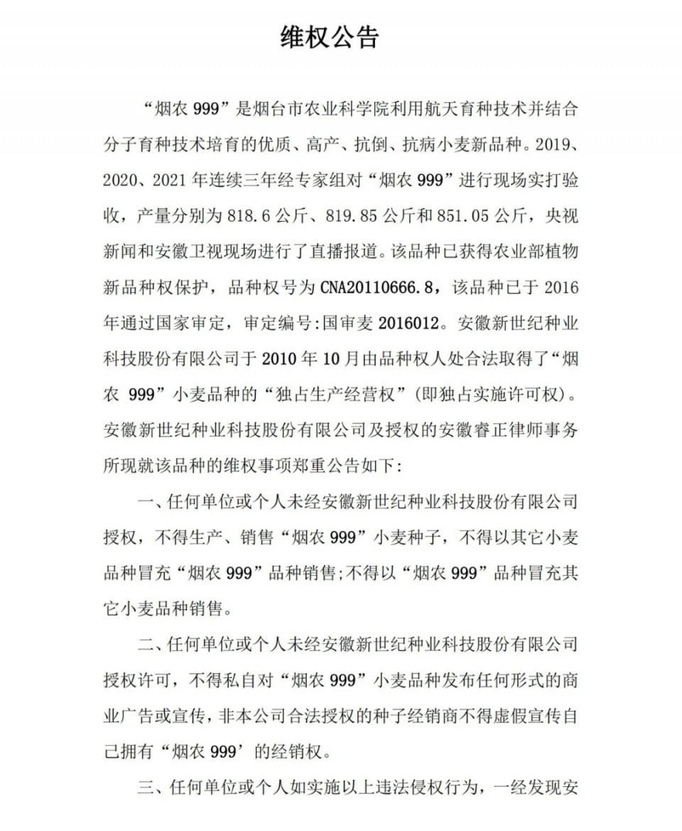 “煙農999”是煙臺市農業科學院利用航天育種技術并結合分子育種技術培育的優質、高產、抗倒、抗病小麥新品種。2019、2020、2021年連續三年經專家組對“煙農999”進行現場實打驗收,產量分別為818.6公斤、819.85公斤和851.05公斤,央視新聞和安徽衛視現場進行了直播報道。該品種已獲得農業部植物新品種權保護,品種權號為CNA20110666.8,該品種已于2016年通過國家審定,審定編號:國審麥2016012。安徽新世紀種業科技股份有限公司于2010年10月由品種權人處合法取得了“煙農 999”小麥品種的“獨占生產經營權”(即獨占實施許可權)。安徽新世紀種業科技股份有限公司及授權的安徽睿正律師事務所現就該品種的維權事項鄭重公告如下: