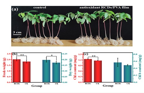 研究團隊提出了對應的抗氧化策略,獲得了抗拉伸性能良好且具有抗氧化能力的抗氧化RCDs/PVA轉光膜,實現了黃綠光向紅光的轉光。與空白薄膜相比,該RCDs/PVA薄膜能促進綠豆芽生長。實驗結果表明,經該轉光薄膜處理的綠豆芽植株鮮重增加10.4%、干重增加13.9%、葉綠素a的含量增加7.1%,紅光碳量子點作為轉光劑形成的抗氧化農用膜在溫室蔬菜栽培中具有明顯增產潛力。