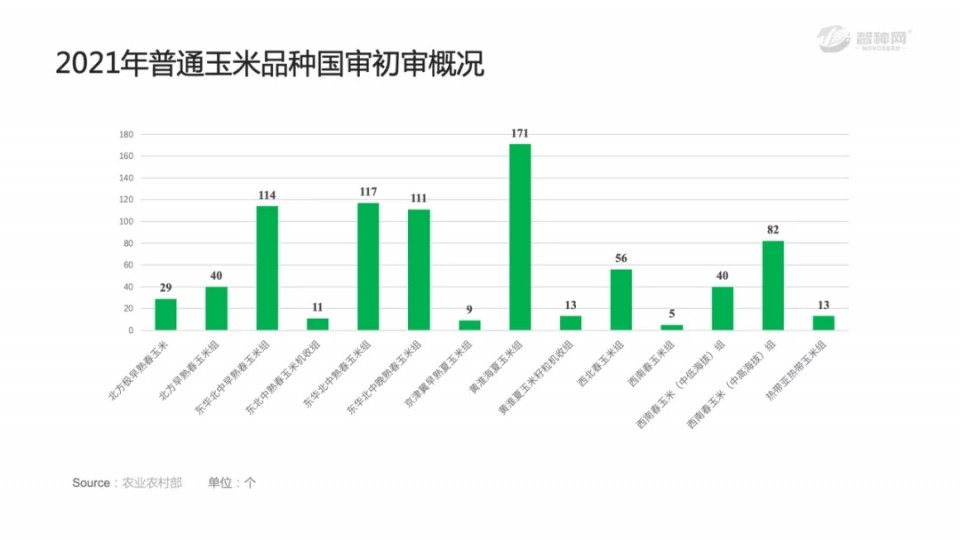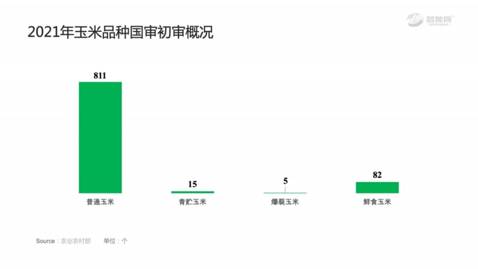 2020年青貯玉米品種國審數量為22個,而今年國審初審青貯玉米品種為15個,同比減少 7個。2020年普通玉米品種國審數量為702個,而今年國審初審普通玉米品種為811個,同比增加109個。