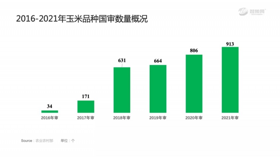 近日,農業農村部公示了2021年國審初審玉米品種,數量高達913個,比2020的806個品種多107個,同比增長13%;是2019年國審品種(664個)的1.375倍,是2018年國審品種(631個)的1.44倍,2017年(171個)國審品種的5.34倍,2016年(34個)的26.85倍。