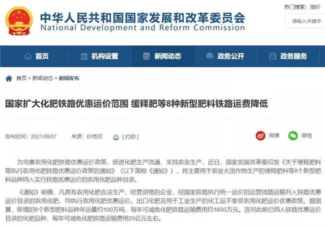 為完善農用化肥鐵路優惠運價政策,促進化肥生產流通,支持農業生產,近日,國家發展改革委印發《關于緩釋肥料等執行農用化肥鐵路優惠運價政策的通知》(以下簡稱《通知》),將主要用于農業大田作物生產的緩釋肥料等8個新型肥料品種納入實行鐵路優惠運價的農用化肥品種目錄。