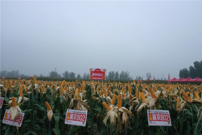 跟隨著公司人員的講解,經銷商們首先映入眼簾的是通過黃淮海六省審定、春夏播雙審定黃金大棒玉米新品種冀農802。據介紹,S型冀農802導入了抗銹病基因、堅桿基因等多種優良農藝性狀,其抗病性、抗倒性得到了顯著提升,對高溫熱害、低溫寡照等災害性天氣抗性增強,更抗病、更抗逆,莖稈穗位都低了10厘米,果穗更是均勻一致,產量也更高、更穩定。
