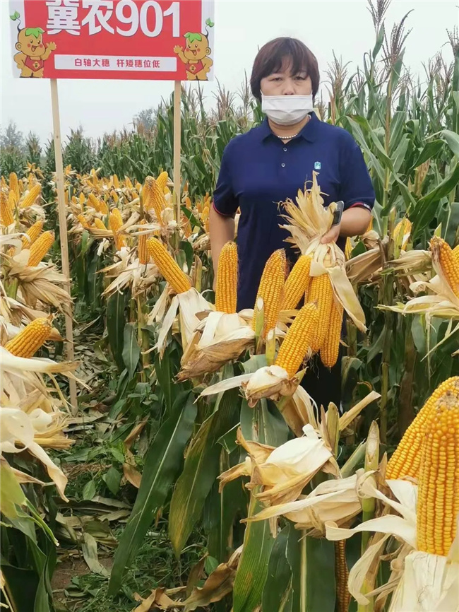 與會經銷商觀摩的第三個品種是冀農種業2020年最新審定的冀農901。該品種是河北冀農種業自主研發培育的矮桿、抗逆、耐旱的白軸大穗型玉米品種。主要優勢表現為:出苗快,長勢壯,莖稈粗,秸稈矮,穗位低,抗倒強;葉片濃綠,穗上葉片上沖,田間通透,棒三葉寬大,光合作用極佳,天穗分支多,花粉量大,耐高溫不禿尖;包葉緊,夾角小,不爛頂,活稈成熟,灌漿快,結實強,籽粒焦黃,軸細粒深,出籽多;田間穗位一致、里外棒穗一致,不空棵,無小苗。黃淮海夏播一般地塊1600斤以上,高水肥地塊達2001斤。春播最高畝產達2800斤以上。