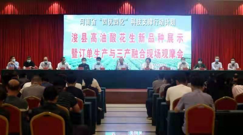 9月18日,河南省農科院在鶴壁市浚縣組織召開優質高油酸花生新品種展示暨訂單生產與三產融合現場觀摩會。中國工程院院士、河南省農科院院長張新友,鶴壁市委常委、市政府黨組成員李暉,省農業農村廳經作處處長黃偉,省經濟作物推廣站站長鄭乃福,浚縣縣委書記王海濤等領導和專家出席會議。