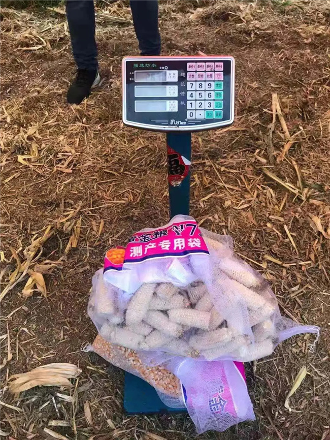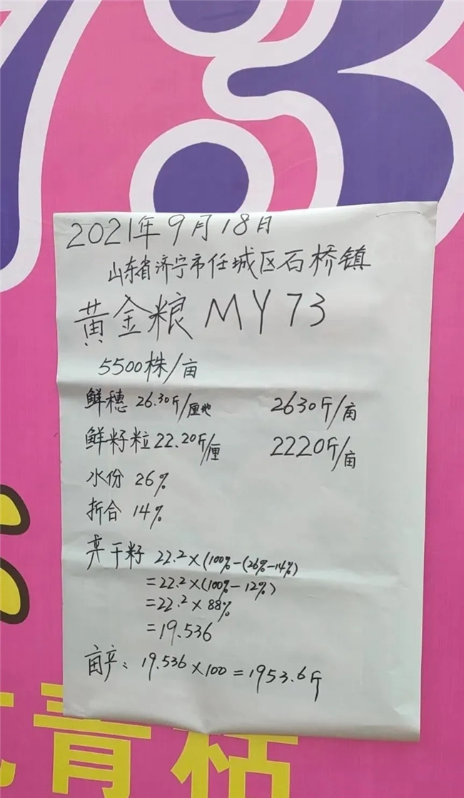 在觀摩現場進行一厘地測產,與會人員現場參與掰棒、脫粒,黃金糧73折合14%水分畝產1953.6斤/畝,國審黃金糧73真正的超高產玉米品種!
