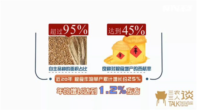 農業現代化,種子是基礎。目前,我國農作物良種覆蓋率達到96%以上,自主品種面積占比超過95%,良種對糧食增產的貢獻率達到45%。近20年,糧食作物單產累計增長約25%,年均增長達到1.2%左右。一大批高產高效、優質綠色、多抗廣適、各具特色的品種相繼涌現,為保障糧食“17年豐”,連續6年穩定在1.3萬億斤以上提供了關鍵支撐,這是一個了不起的成就。