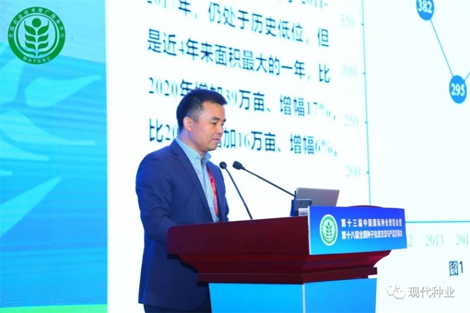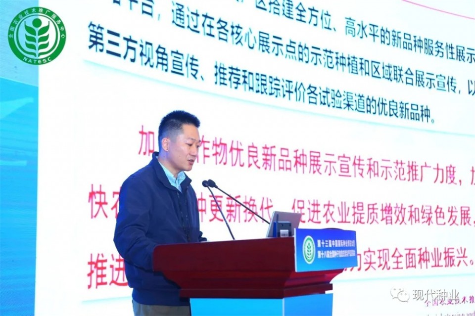 全國農技中心品種區試處副處長曾波就《2021年度水稻小麥玉米新品種核心展示信息發布》作主旨報告