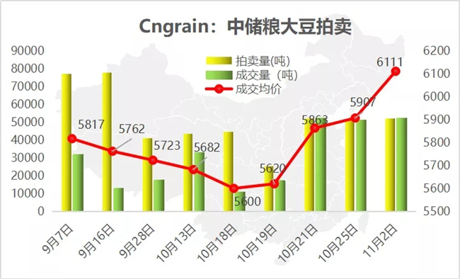 中儲糧拍賣(mai)量價齊升帶動豆價上(shang)揚。10月21日以來的三次大豆拍賣(mai)均(jun)(jun)100%成(cheng)(cheng)交,11月2日中儲糧計劃拍賣(mai)的52395噸的大豆再度全(quan)部(bu)成(cheng)(cheng)交,銷售均(jun)(jun)價6111元(yuan)/噸,東北產區最(zui)高溢價400元(yuan)/噸。