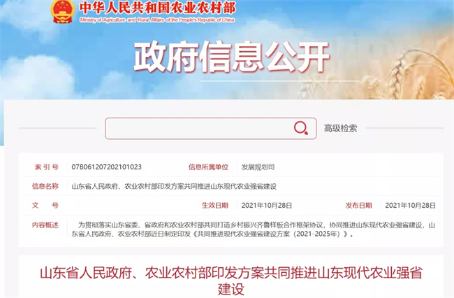 為貫徹落實山東省委、省政府和農業農村部共同打造鄉村振興齊魯樣板合作框架協議,協同推進山東現代農業強省建設,近日,山東省人民政府、農業農村部制定印發《共同推進現代農業強省建設方案(2021-2025年)》(以下簡稱《方案》)。