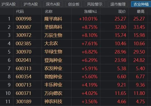 農業板塊9日盤中發力拉升,種業股表現亮眼。隆平高科漲停,荃銀高科漲近8%,大北農、登海種業漲幅超5%,農發種業、萬向德農、敦煌種業等漲幅超4%。值得注意是,登海種業盤中一度漲停。