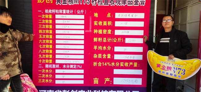 在與會人員現場親自參與量地、稱重、水分測量后, 黃金糧73折合14%水分畝產1701.5斤/畝,黃金糧73~真正的高產、穩產玉米品種!