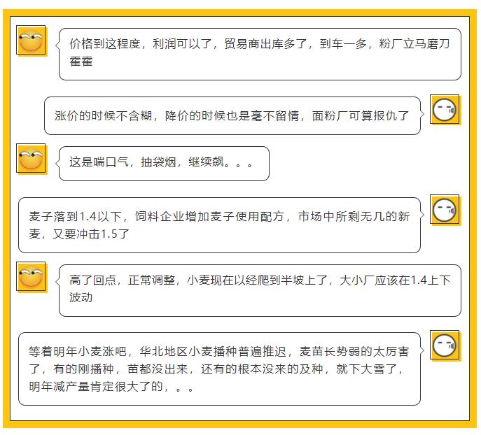 這波行情,國家從主產區最高點山東開始滅火降溫,后續必然更加理性。而且近期選擇高點套現的貿易糧比較多,疊加各級儲備輪出小麥積極性的提高,面粉搶購平復,調控預期正在增加,短期行情有望繼續回調。針對當前行情,中華糧網小麥群里也是眾說紛,分享幾個觀點供大家參考: