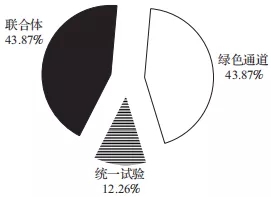 圖5顯示了不(bu)同試(shi)驗(yan)渠道審(shen)(shen)定(ding)(ding)品種(zhong)(zhong)的占比情(qing)況。從圖5可以看出,不(bu)同渠道審(shen)(shen)定(ding)(ding)品種(zhong)(zhong)數量(liang)不(bu)同,其中統(tong)一(yi)試(shi)驗(yan)審(shen)(shen)定(ding)(ding)品種(zhong)(zhong)19個(ge),占審(shen)(shen)定(ding)(ding)數量(liang)的12.26% ;聯合(he)(he)體(ti)(ti)試(shi)驗(yan)和(he)綠(lv)(lv)色通(tong)道試(shi)驗(yan)審(shen)(shen)定(ding)(ding)品種(zhong)(zhong)數量(liang)一(yi)致(zhi),均為68個(ge),均占審(shen)(shen)定(ding)(ding)品種(zhong)(zhong)數量(liang)的43.87%。總體(ti)(ti)上(shang)看統(tong)一(yi)試(shi)驗(yan)審(shen)(shen)定(ding)(ding)品種(zhong)(zhong)不(bu)多(duo),每年保持在5個(ge)左右,而聯合(he)(he)體(ti)(ti)和(he)綠(lv)(lv)色通(tong)道試(shi)驗(yan)審(shen)(shen)定(ding)(ding)品種(zhong)(zhong)均占到了40%以上(shang),且聯合(he)(he)體(ti)(ti)較綠(lv)(lv)色通(tong)道占比大,表明聯合(he)(he)體(ti)(ti)和(he)綠(lv)(lv)色通(tong)道審(shen)(shen)定(ding)(ding)品種(zhong)(zhong)已占據主導(dao)。