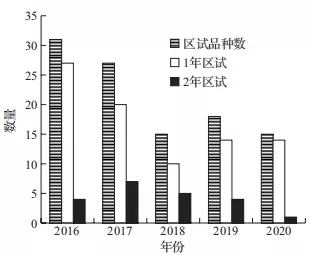 相比國家(jia)東華北(bei)(bei)中(zhong)(zhong)熟(shu)、中(zhong)(zhong)晚熟(shu)等春(chun)玉米組(zu)而言,西(xi)北(bei)(bei)春(chun)玉米組(zu)每(mei)(mei)年(nian)(nian)(nian)(nian)(nian)試(shi)(shi)(shi)驗的(de)品(pin)(pin)(pin)種(zhong)(zhong)(zhong)數(shu)(shu)(shu)量(liang)(liang)(liang)(liang)相對較(jiao)(jiao)少。2016-2020年(nian)(nian)(nian)(nian)(nian)這5年(nian)(nian)(nian)(nian)(nian)間,西(xi)北(bei)(bei)春(chun)玉米組(zu)共有(you)106個(ge)品(pin)(pin)(pin)種(zhong)(zhong)(zhong)參(can)(can)加區(qu)(qu)域(yu)試(shi)(shi)(shi)驗,平(ping)均每(mei)(mei)年(nian)(nian)(nian)(nian)(nian)約(yue)21個(ge);共有(you)24個(ge)品(pin)(pin)(pin)種(zhong)(zhong)(zhong)參(can)(can)加生(sheng)產試(shi)(shi)(shi)驗,平(ping)均每(mei)(mei)年(nian)(nian)(nian)(nian)(nian)約(yue)5個(ge)。從每(mei)(mei)年(nian)(nian)(nian)(nian)(nian)參(can)(can)加試(shi)(shi)(shi)驗的(de)品(pin)(pin)(pin)種(zhong)(zhong)(zhong)數(shu)(shu)(shu)量(liang)(liang)(liang)(liang)看,各(ge)年(nian)(nian)(nian)(nian)(nian)度之間差異比較(jiao)(jiao)明顯。其中(zhong)(zhong),2016年(nian)(nian)(nian)(nian)(nian)是這5年(nian)(nian)(nian)(nian)(nian)中(zhong)(zhong)參(can)(can)加區(qu)(qu)域(yu)試(shi)(shi)(shi)驗品(pin)(pin)(pin)種(zhong)(zhong)(zhong)數(shu)(shu)(shu)量(liang)(liang)(liang)(liang)最(zui)多的(de)年(nian)(nian)(nian)(nian)(nian)份,達到(dao)31個(ge);其次是2017年(nian)(nian)(nian)(nian)(nian),數(shu)(shu)(shu)量(liang)(liang)(liang)(liang)為(wei)(wei)27個(ge);2018-2020年(nian)(nian)(nian)(nian)(nian)這3年(nian)(nian)(nian)(nian)(nian)每(mei)(mei)年(nian)(nian)(nian)(nian)(nian)參(can)(can)試(shi)(shi)(shi)品(pin)(pin)(pin)種(zhong)(zhong)(zhong)數(shu)(shu)(shu)量(liang)(liang)(liang)(liang)比較(jiao)(jiao)穩定(ding),都在(zai)20個(ge)以(yi)下(xia),其中(zhong)(zhong)2019年(nian)(nian)(nian)(nian)(nian)為(wei)(wei)18個(ge),2018年(nian)(nian)(nian)(nian)(nian)和2020年(nian)(nian)(nian)(nian)(nian)均為(wei)(wei)15個(ge),不足2016年(nian)(nian)(nian)(nian)(nian)的(de)一(yi)半。由圖1可知(zhi),從 2017 年(nian)(nian)(nian)(nian)(nian)之后,西(xi)北(bei)(bei)春(chun)玉米組(zu)參(can)(can)試(shi)(shi)(shi)品(pin)(pin)(pin)種(zhong)(zhong)(zhong)數(shu)(shu)(shu)量(liang)(liang)(liang)(liang)明顯下(xia)降,一(yi)方面與綠(lv)色通道(dao)(dao)(dao)、聯合體(ti)試(shi)(shi)(shi)驗大規模開展有(you)直接的(de)關系,試(shi)(shi)(shi)驗渠(qu)道(dao)(dao)(dao)的(de)拓寬使得大量(liang)(liang)(liang)(liang)新(xin)育(yu)成的(de)品(pin)(pin)(pin)種(zhong)(zhong)(zhong)涌入了綠(lv)色通道(dao)(dao)(dao)和聯合體(ti)試(shi)(shi)(shi)驗,緩解了統一(yi)試(shi)(shi)(shi)驗的(de)壓(ya)力;另一(yi)方面由于統一(yi)試(shi)(shi)(shi)驗經費(fei)緊張,國家(jia)控制統一(yi)試(shi)(shi)(shi)驗規模,造成了參(can)(can)試(shi)(shi)(shi)品(pin)(pin)(pin)種(zhong)(zhong)(zhong)數(shu)(shu)(shu)量(liang)(liang)(liang)(liang)下(xia)降。