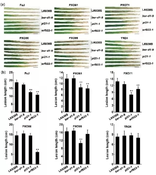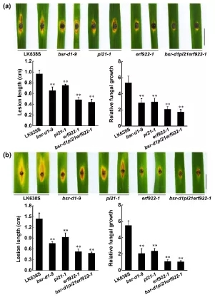 圖2:敲除Pi21或ERF922的材料對白葉枯病的抗性顯著增強