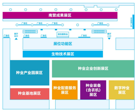 大會同期在會場一樓大廳和風雨長廊設置了近7000平方米的展區,開辟了南繁成果、生物技術、種業產業園、種業企業創新、種業基地、種業配套服務、種業裝備(含農機)、數字種業等八大功能展區。分區域展示,分區域設計,打造有序展示氛圍,增強集中展示效果(平面圖見本方案第五項)。