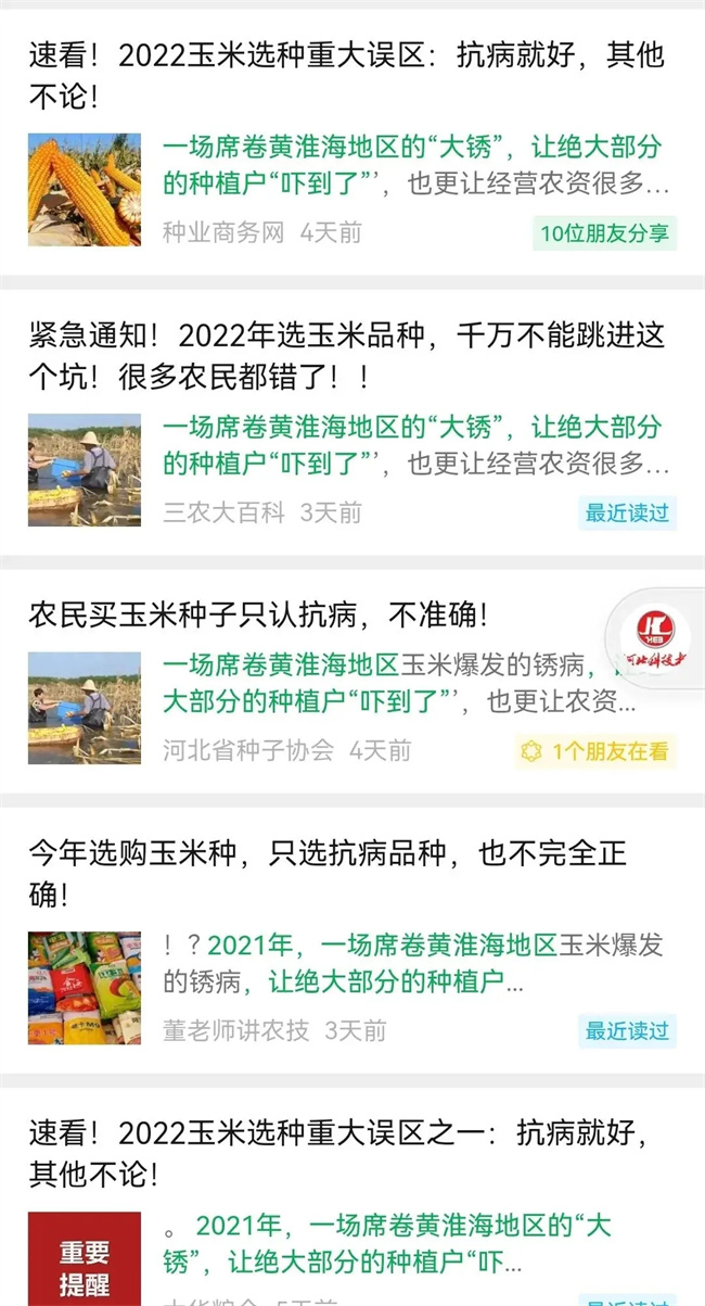 然而,在2022年的1月3日,《種業商務網》以《速看,2022玉米選種重大誤區:抗病就好,其他不論》為題轉載以后,短短不足4天的時間,閱讀量就達到了2萬+。再然后,本文題目稍作修改后就接連被河北省種子協會、河北科技報、植保中心等十幾家自媒體平臺先后轉載。