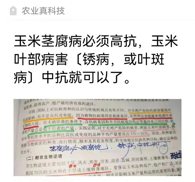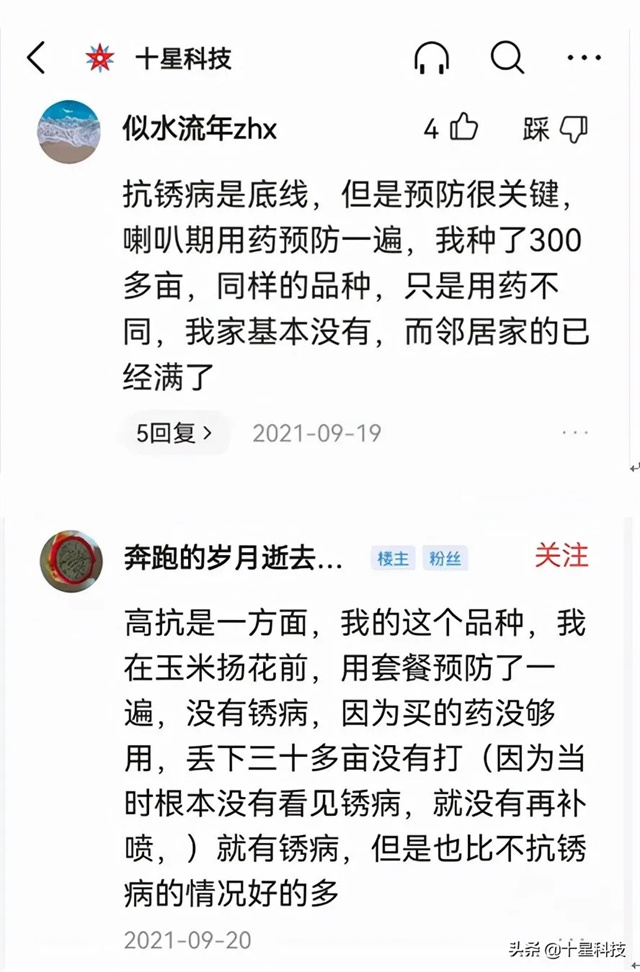 如果一個玉米品種能夠【高抗雙倒】,僅僅是“抗銹差一些”甚至是【不抗銹病】,反倒是很容易對付的事情了——每畝地僅僅幾元錢的殺菌劑一噴就可以了。