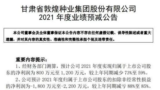 1月26日,敦煌種業發布2021年年度業績預告:預計公司2021年度實現歸屬于上市公司股東的凈利潤為800萬元至1,200萬元,較上年同期減少59%至73%。