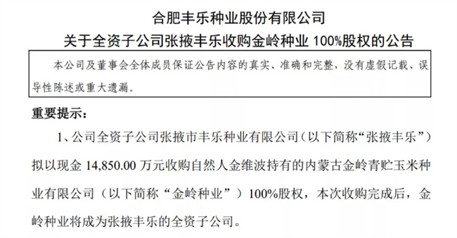 1月27日,豐樂種業(000713.SZ)發布公告稱,全資子公司張掖市豐樂種業有限公司(下稱“張掖豐樂”)擬以現金1.49億元收購自然人金維波持有的內蒙古金嶺青貯玉米種業有限公司(下稱“金嶺種業”)100%股權,收購完成后,金嶺種業將成為張掖豐樂的全資子公司。
