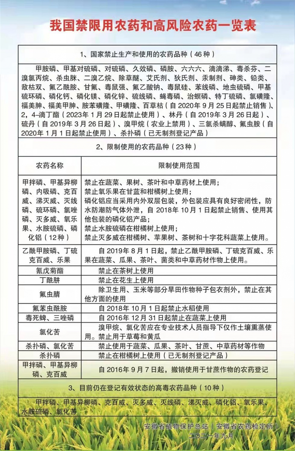 近年來,農業農村部穩步推進高毒高風險農藥淘汰工作,2024年年底前將分期分批再淘汰10種高毒農藥。10種高毒農藥包括甲拌磷、甲基異柳磷、水胺硫磷、滅線磷、涕滅威、滅多威、克百威、氧樂果、磷化鋁、氯化苦。