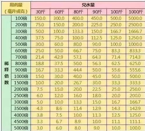 經常有農民咨詢怎么配藥,怎么算兌水量和用藥量,不知其他菜農也有類似的疑問?今天把這個配藥表分享給大家。以下就是常用的用藥量、兌水量和稀釋倍數的對應查詢表。 (表一)