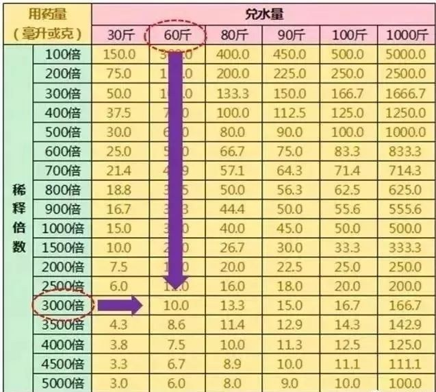 舉個例子,藥劑的稀釋倍數是3000倍,要配60斤水,所需要的藥劑量就是10毫升或10克。同理,30斤水加了6毫升的藥劑,它的稀釋倍數是2500倍。 (如表二)
