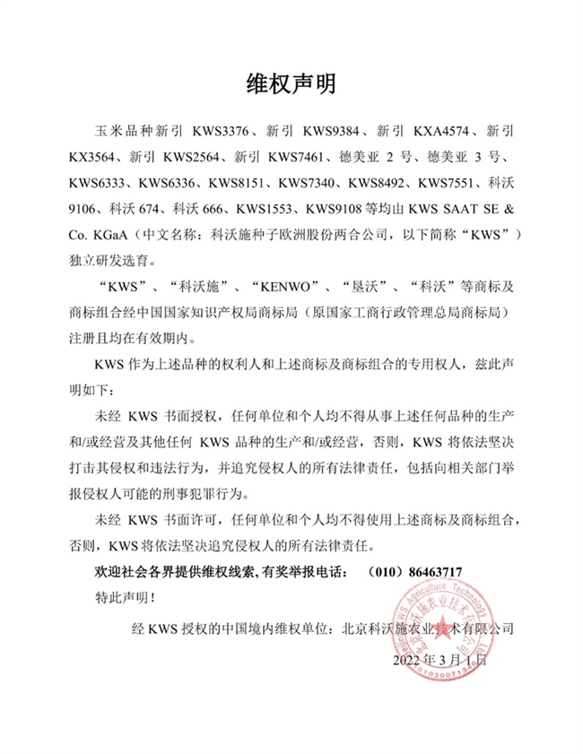 3月(yue)1日,經KWS 授權,KWS在中國境內(nei)的維(wei)權單位——北(bei)京(jing)科沃施農業技(ji)術有(you)限公司于2022年3月(yue)1日發布維(wei)權聲明。
