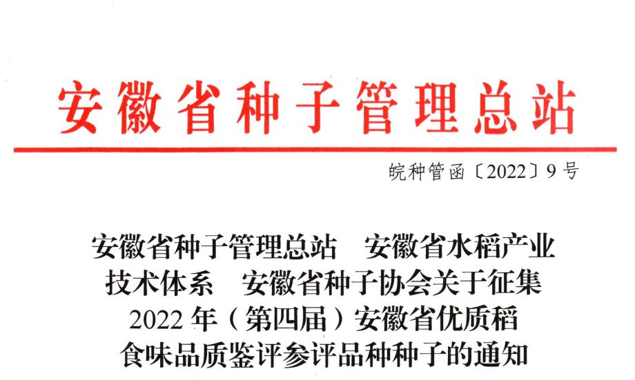為了加快新育成的優質稻品種推廣,進一步滿足市場對優質稻米品種的需求,促進優質稻產業高質量發展,安徽省種子管理總站、安徽省水稻產業技術體系、安徽省種子協會決定聯合開展2022年(第四屆)安徽省優質稻品種食味品質鑒評活動,現征集參評品種種子集中種植,有關事項通知如下。
