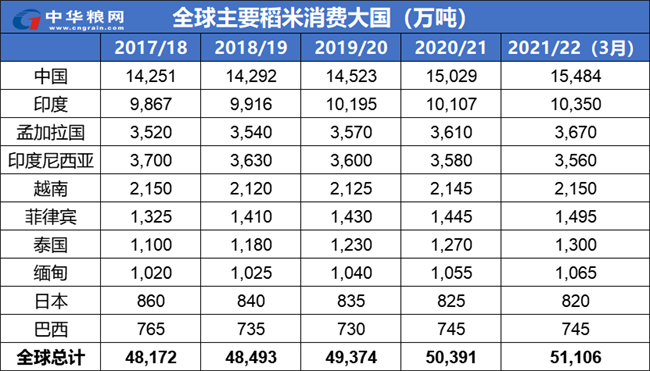 從大米消費量來看,全球大米消費量近年一直呈增長態勢,2021/22年度消費量將達5.1億噸,高于上一年度5.04億噸,相比十年前增長了11%。中國和印度依然排名全球第一、第二名,中國占到全球消費總量的30.4%,印度占到全球消費總量的20.3%,兩國合計占到全球51%。此外,大米消費量排名靠前的還有孟加拉國、印度尼西亞、越南、菲律賓、泰國、緬甸、日本等國家,均集中在亞洲。