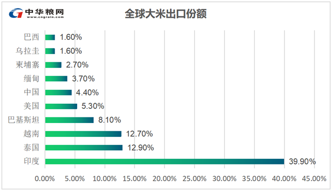 全球大米出口較為集中,主要分布在東南亞地區。其中,印度是第一出口大國,與泰國、越南拉開了很大的距離,占全球出口量40%。