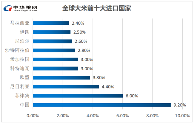 從進口市場來看,中國不僅是大米主要出口國,更是最大的進口國,其次是菲律賓、尼日利亞和歐盟,相較于出口市場,全球大米進口國家分布較為分散。