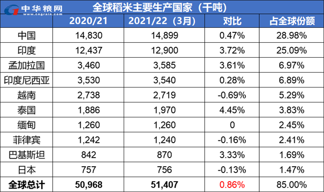 根據美國農業部數據,2021/22年度全球大米產量5.1億噸,其中中國占據29%達到1.49億噸,第二大國印度達到1.25億噸,占到25%。兩個國家產量合計占到全球的54%左右,見表1: