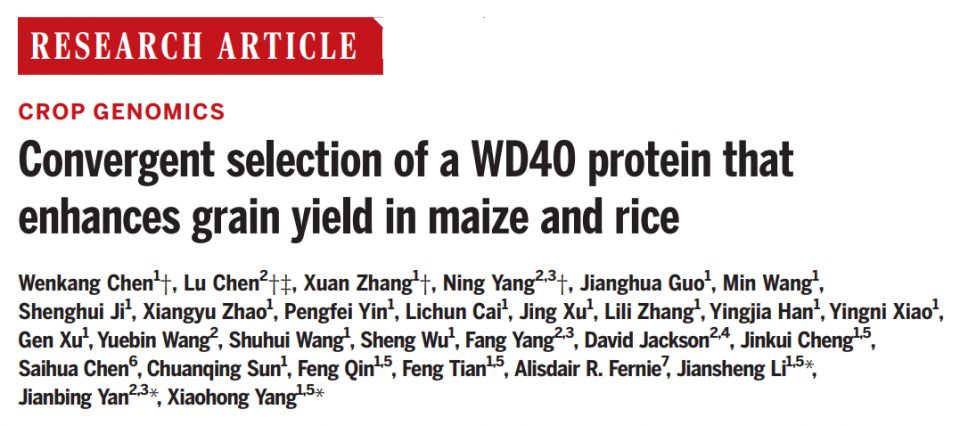 2022年3月25日,中國農業大學李建生/楊小紅團隊聯合華中農業大學嚴建兵團隊在Science發表了題為Convergent selection of a WD40 protein that enhances grain yield in maize and rice的研究論文,從單基因和全基因組兩個層次系統解析了玉米和水稻趨同選擇 (convergent selection) 的遺傳基礎,在全基因組水平上解析了玉米和水稻趨同選擇的遺傳規律。