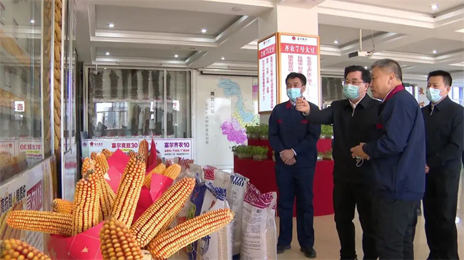 胡昌升省長一行首先來到了富爾農藝企業文化展廳。公司董事長張立、副總經理邢延增分別向領導們介紹了公司發展情況,企業發展歷程和種子育、繁、推建設情況。胡昌升省長對于富爾農藝積極落實中央關于“種業振興行動”表示贊賞,當得知公司十分重視科研創新和每年投入研發費用2500萬元以上時,胡昌升省長非常高興,尤其對富爾農藝擁有一支高水平的專家育種團隊給予了充分表揚,并為富爾農藝能夠重金聘請具有國際知名度的美籍華人、著名生物育種科學家孫書庫博士歸國工作點贊。