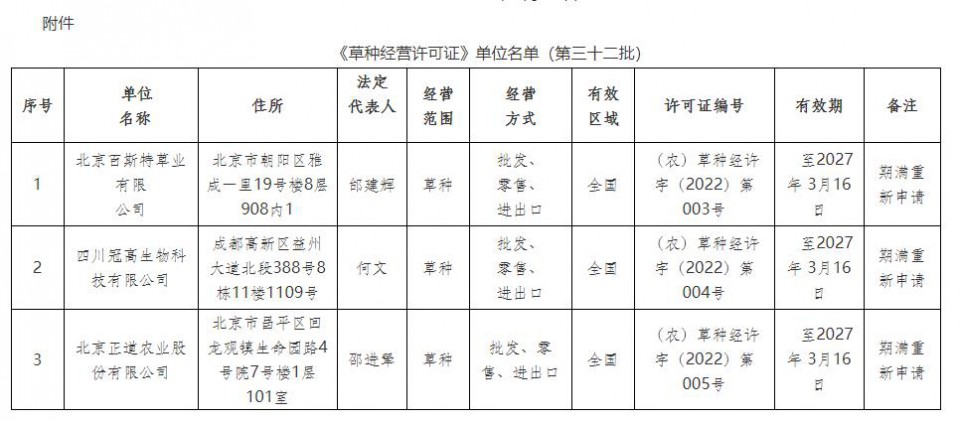根據《中華人民共和國種子法》《中華人民共和國草原法》和《草種管理辦法》等有關規定,批準北京百斯特草業有限公司、四川冠高生物科技有限公司和北京正道農業股份有限公司的草種經營許可申請,并頒發《草種經營許可證》。