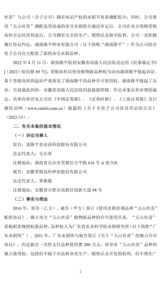 2022 年 4 月 11 日,湖南隆平收到安徽省高級人民法院送達的《民事裁定書》[(2022)皖民轄 89 號],荃銀高科以侵害植物新品種權為由向湖南隆平提起訴訟。