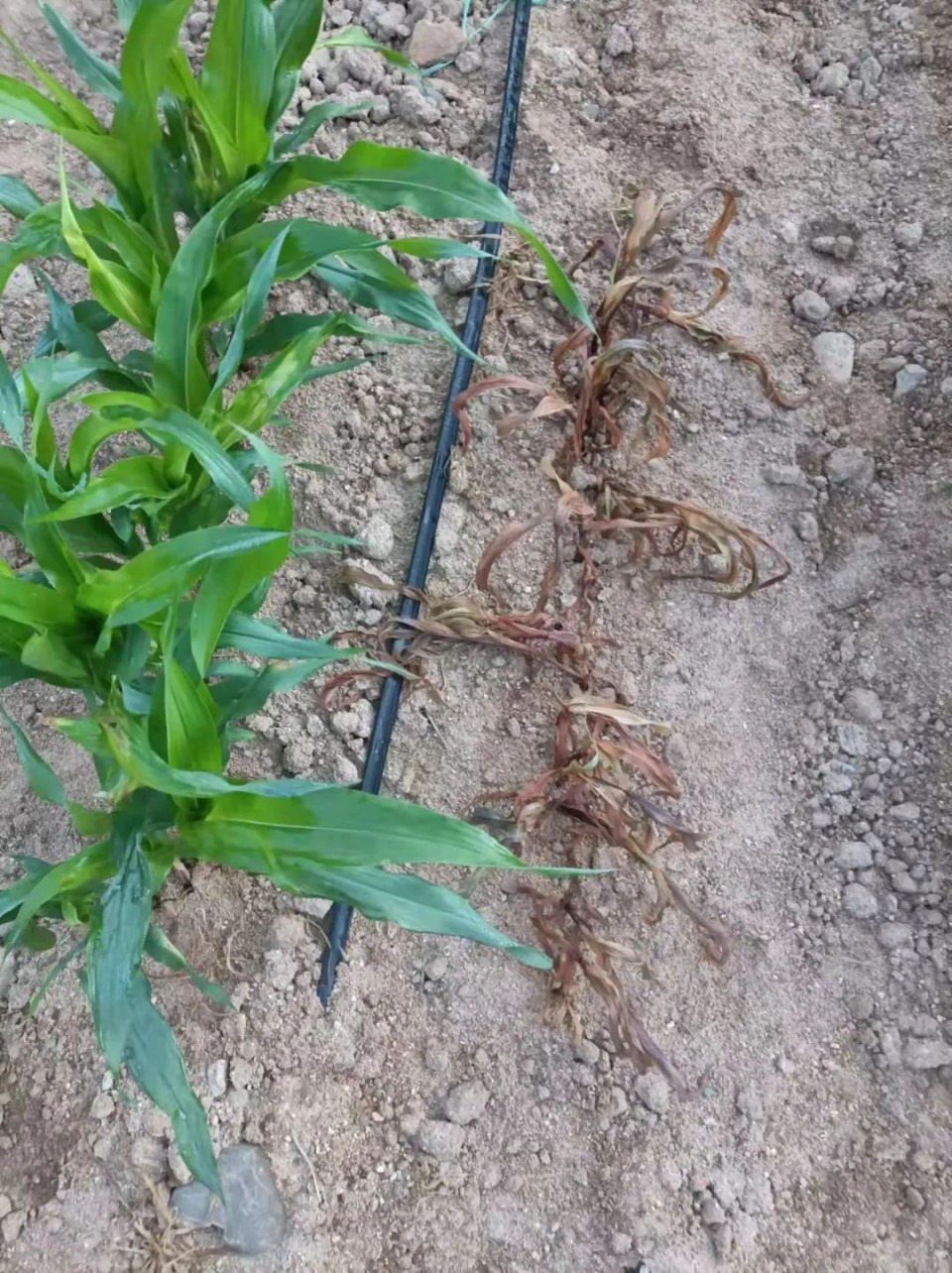 噴施除草劑后的田間表現對比圖。左為抗咪唑啉酮類除草劑玉米品種,右為對照品種。