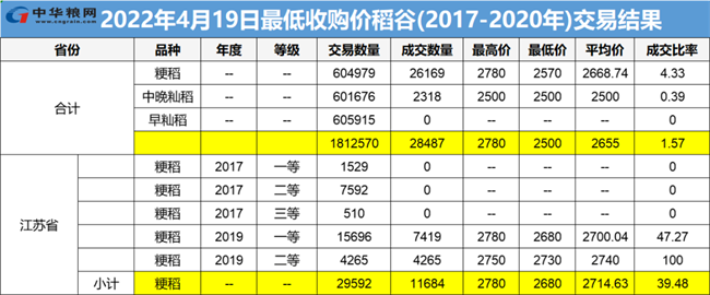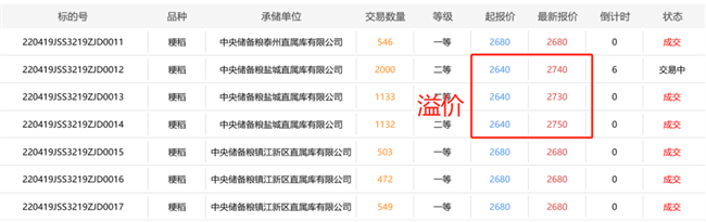 另外最近中儲糧黑龍江分公司輪換糧也很火爆,4月19日(ri)計劃(hua)銷售2017、2018、2019年粳稻51998噸(dun),實際成交48998噸,成交率94.2%,起拍(pai)價為2604元/噸(dun),成交(jiao)價為2652元/噸(dun),溢價48元/噸(dun)。