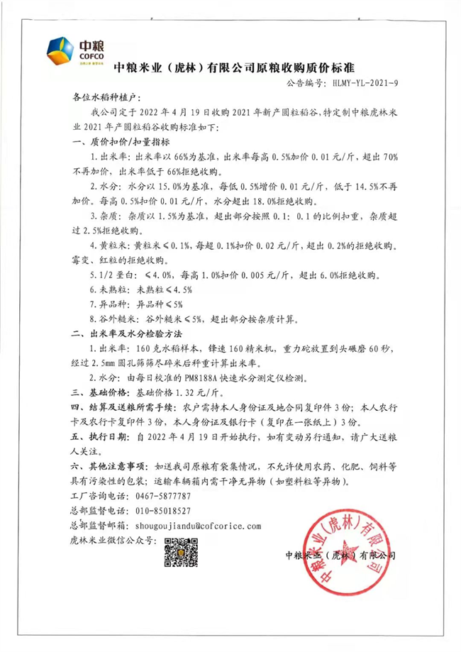 4月19日中糧虎(hu)林(lin)圓粒稻谷收購價格1.32元/斤,出米(mi)66%,水分15%為基準,相比(bi)4月初上漲3分錢。