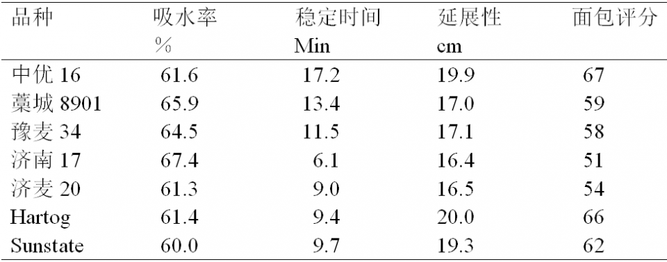 (3)近期在研究的基礎上,我們逐步認識到,延展性是決定優質品種加工品質的一個非常重要的因素,我們以下表1所列數據來進行說明。在面團筋力達到一定程度后,延展性對面包成品加工品質的優劣起決定作用。因此,針對這一情況,在了解當前品種延展性的基礎上,再針對優質強筋品種的面包品質進行改良,組配雜交組合,應該更有效果。